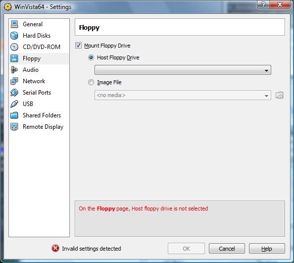If a floppy device is to be made available to the guest operating system the Mount Floppy Drive option must first be selected. Once selected, the remaining options on the screen are enabled. The floppy device presented to the virtual machine may be in the form of a physical device connected to the host, or an ISO image file visible to the host operating system. In the case of an ISO image, the file must be added to the media library using the Virtual Media Manager before it can be attached to a virtual machine. To access the Virtual Media Manager, click on the button located to the right of the ISO image file menu.