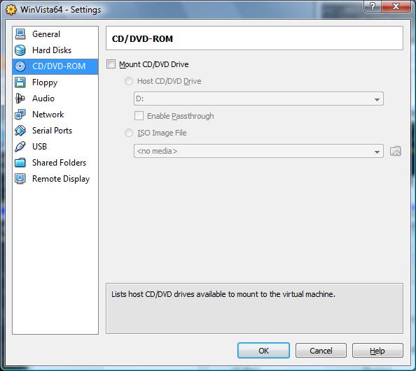 When using a physical device connected to the host, the option is also available to Enable Passthrough. This option allows the guest operating system to send ATAPI commands directly to the physical device so that CD/DVD writers can be used from within the virtual machine.
