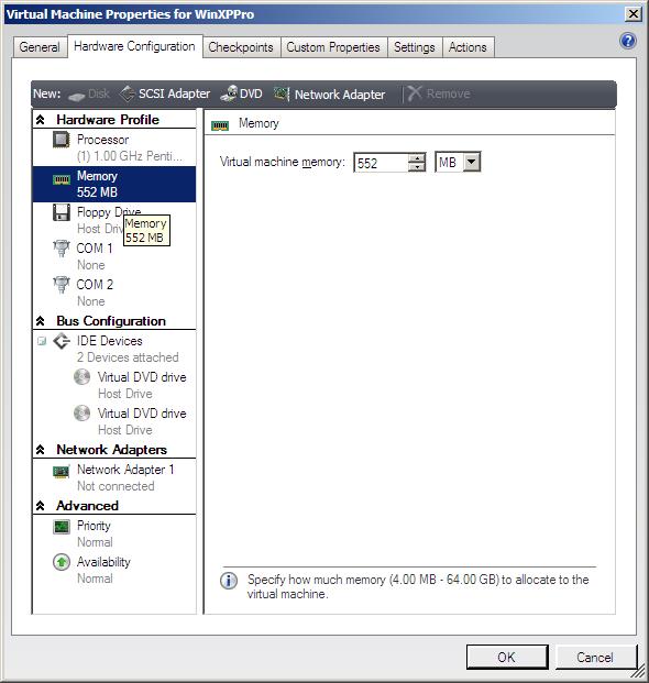 The virtual machine properties contained with the VMware .vmx file may be viewed and modified prior to the V2V conversion by selecting the .vmx file in the library (as illustrated in the case of the WinXPPro.vmx file in the above figure) and selecting Properties from the resulting menu. The following screen shows the memory settings for the WinXPPro .vmx configuration file: