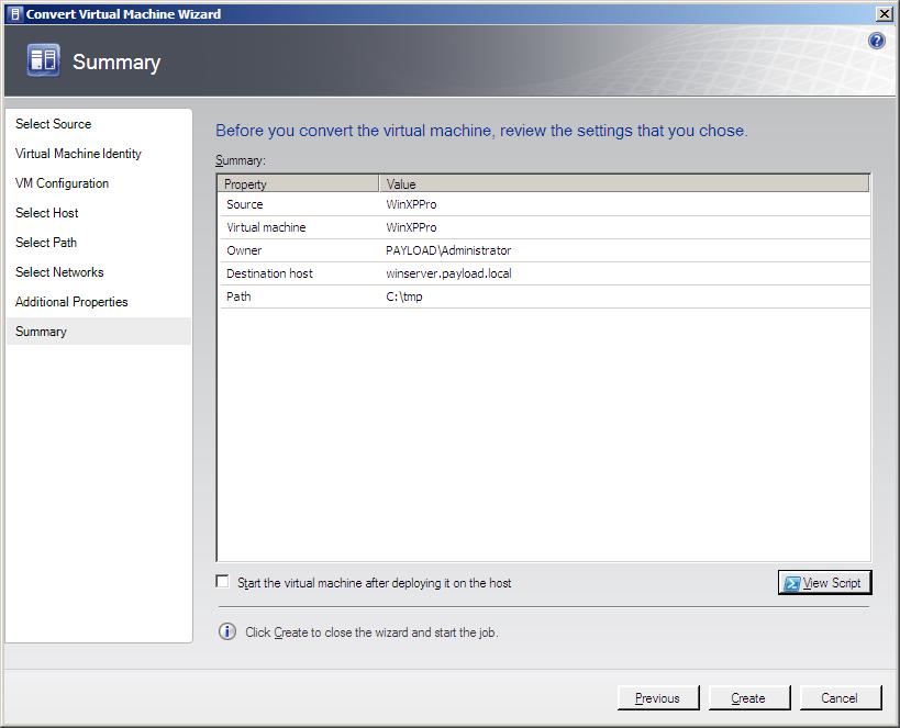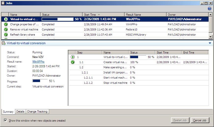 Review the summary information and click Create to begin the V2V conversion process. The duration of the conversion process will vary depending on a variety of factors such as the size of the disk image files and the performance and location of the destination host. The progress of the conversion process is reported on the Jobs dialog which is displayed by default at the start of the creation process. If the Jobs dialog is not configured to appear by default, it may be launched by clicking on the Jobs button in the VMM Administrator Console toolbar.