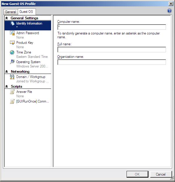- Computer name - Allows the name of the computer to be defined. Since a profile may be used for many different virtual machines on the same network, having the same computer name for all systems is likely to cause problems. To avoid this problem, an asterisk may be entered into this field to instruct VMM to assign a random computer name to the guest OS when it is created.