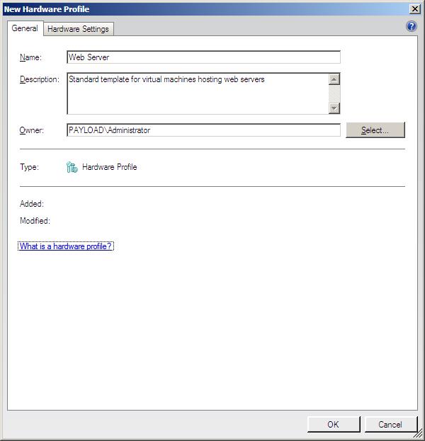 As previously described, hardware profiles define a baseline hardware configuration for a virtual machine. Once created, a hardware profile may be imported into new templates as they are created. Any virtual machines which are subsequently created using those templates will be configured to match the corresponding hardware profile.