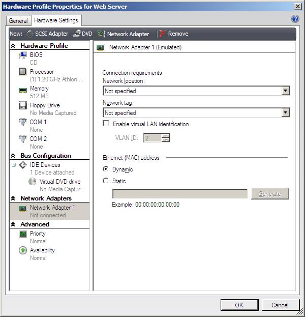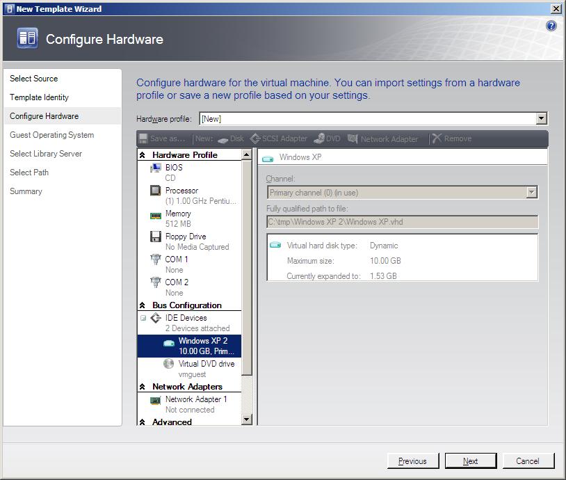 - If a pre-existing virtual hard disk was selected from the library as the source for the template, the Hardware profile menu selection may be left as [New] and the configuration settings manually configured to meet the requirements for the virtual machine.