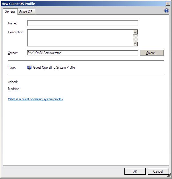 The General screen requires that the profile be named and an owner with an Active Directory domain account assigned. An optional description may also be provided. The Guest OS tab allows a number of operating system specific settings to be configured into the profile: