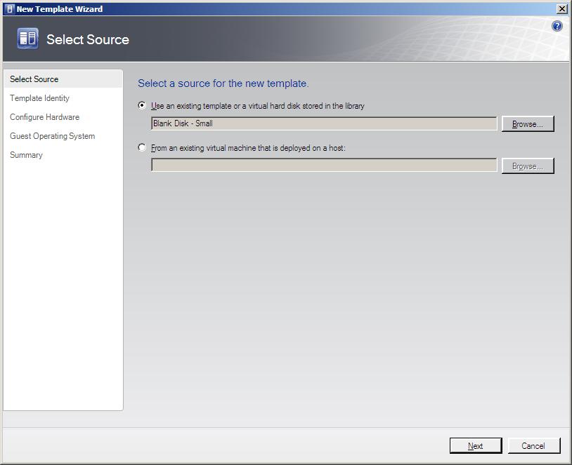 The first screen is where the source of the template is to be found, either in the form of an existing virtual hard disk stored in the Library, or from an existing virtual machine. In order to base the new template on an existing virtual machine, use the Browse button to navigate to the desired virtual machine.